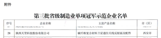 近日,陜西省工業(yè)和信息化廳發(fā)布第三批陜西省制造業(yè)單項(xiàng)冠軍示范企業(yè)名單,陜西天翌科技股份有限公司榜上有名。