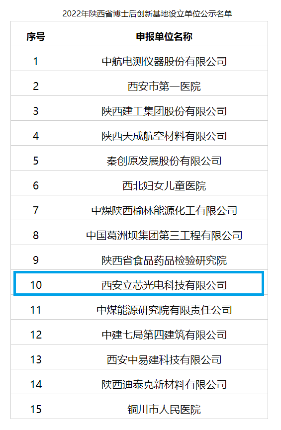近日,陜西省人力資源和社會保障廳發(fā)布2022年陜西省博士后創(chuàng)新基地設立單位公示的公告,西安立芯光電科技有限公司(“以下簡稱立芯光電”)成為2022年度新設立省級博士后創(chuàng)新基地的15家單位之一。