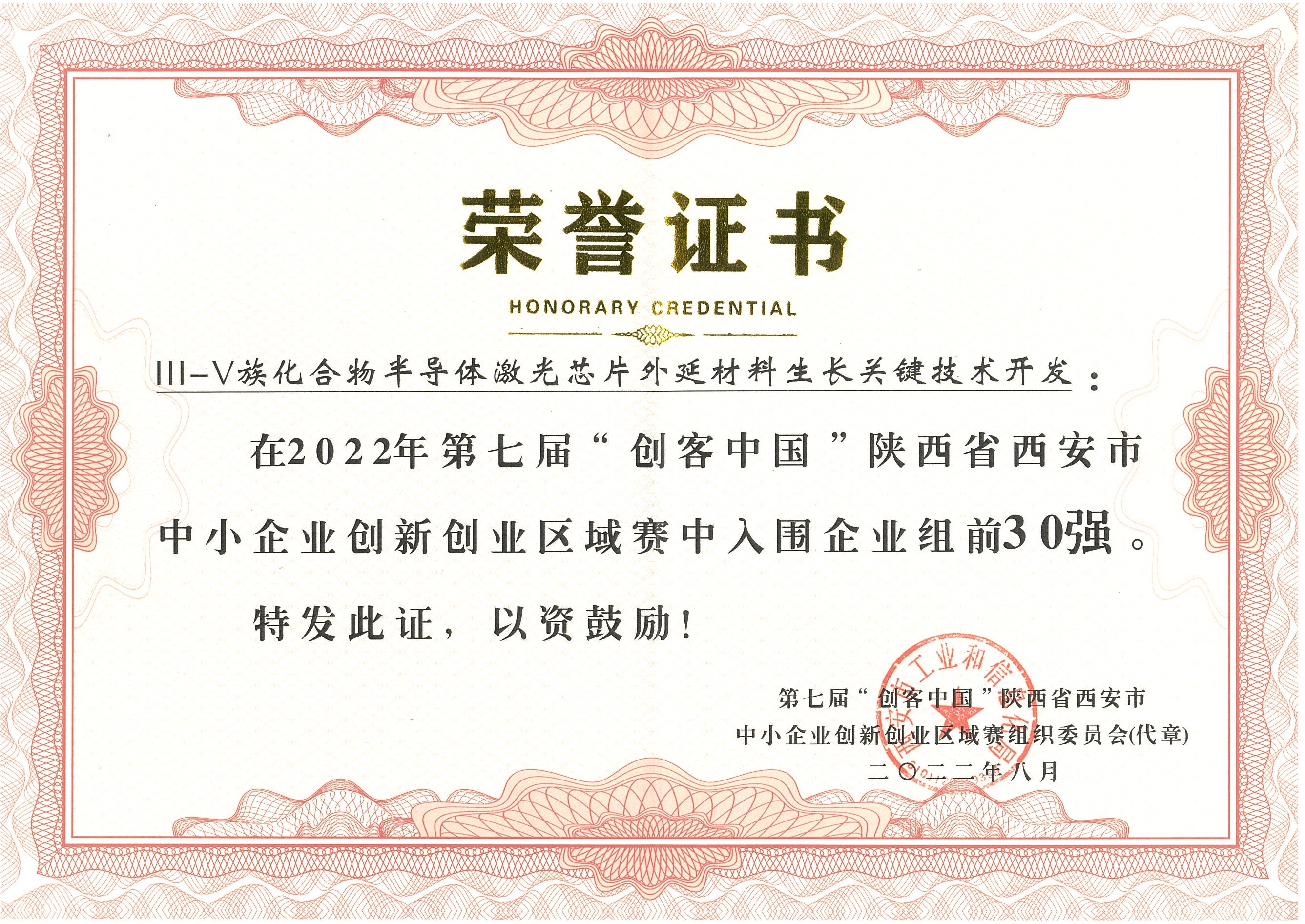 近日,公司的III-V族化合物半導(dǎo)體激光芯片外延材料生長關(guān)鍵技術(shù)開發(fā)項(xiàng)目(以下簡稱外延項(xiàng)目),在“創(chuàng)客中國”西安市中小企業(yè)創(chuàng)新創(chuàng)業(yè)區(qū)域賽(以下簡稱創(chuàng)客中國西安區(qū)域賽)復(fù)賽取得優(yōu)異成績,獲得“創(chuàng)客中國”陜西省西安市中小企業(yè)創(chuàng)新創(chuàng)業(yè)區(qū)域賽組織委員會頒發(fā)的30強(qiáng)企業(yè)榮譽(yù)證書。