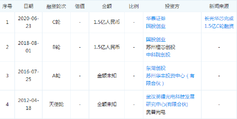 截至目前,長(zhǎng)光華芯至今已完成四輪超3億元融資。企查查顯示,長(zhǎng)光華芯2012年獲得奧普光電天使輪融資;2016年獲得東湖創(chuàng)投等A輪融資;2018年7月,長(zhǎng)光華芯順利完成1.5億元B輪融資;C輪1.5億元融資于2020年6月23日完成。