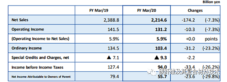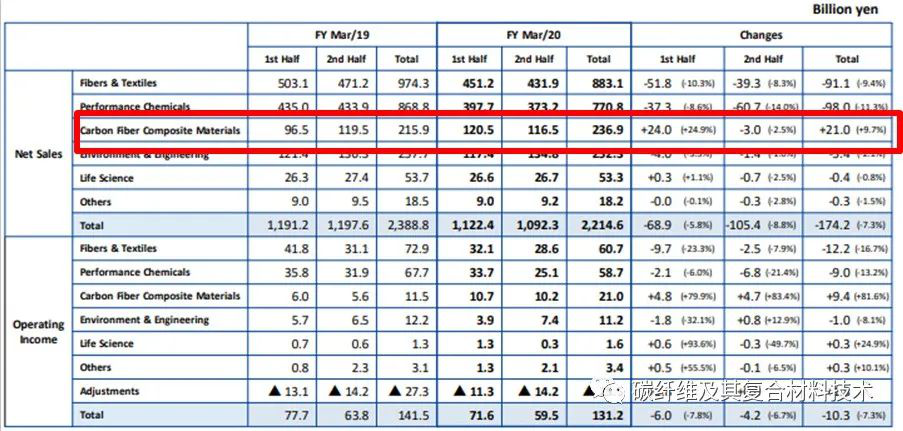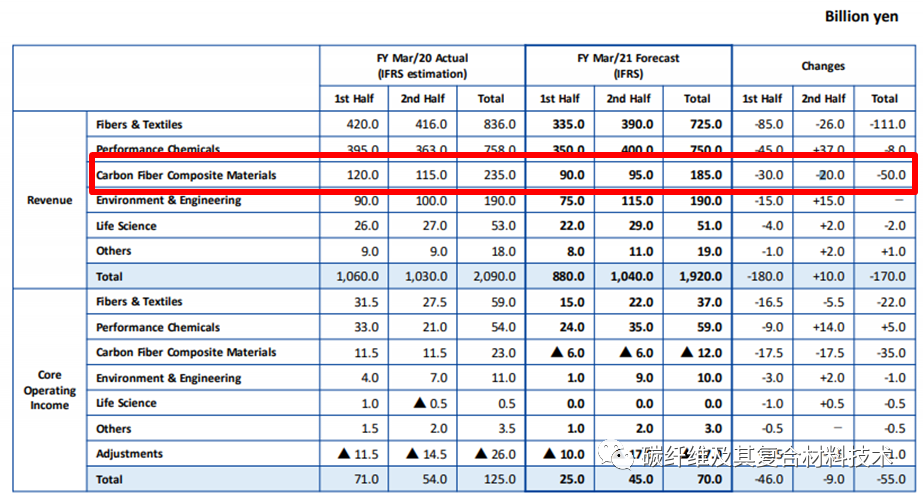根據(jù)東麗公司公布的未來(lái)年度規(guī)劃,預(yù)計(jì)在2020財(cái)年(2020.04.01—2021.03.31)公司碳纖維復(fù)合材料銷售收入將由2350億日元下降到1850億日元,下降幅度高達(dá)50%,其中前半年下降幅度為30%,下半年下降幅度為20%。