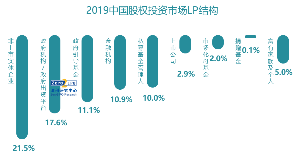 根據(jù)清科研究中心數(shù)據(jù)統(tǒng)計(jì),2019年中國(guó)股權(quán)投資市場(chǎng)全年LP投資人民幣基金近萬(wàn)億。其中,以企業(yè)(含上市企業(yè)和非上市企業(yè))、政府機(jī)構(gòu)/政府出資平臺(tái)、政府引導(dǎo)基金為主要的LP類型,占比分別為24.3%、17.6%和11.1%,企業(yè)取代傳統(tǒng)金融機(jī)構(gòu)成為第一大“LP”,政府機(jī)構(gòu)/政府出資平臺(tái)和政府引導(dǎo)基金的占比排名有明顯的提升。