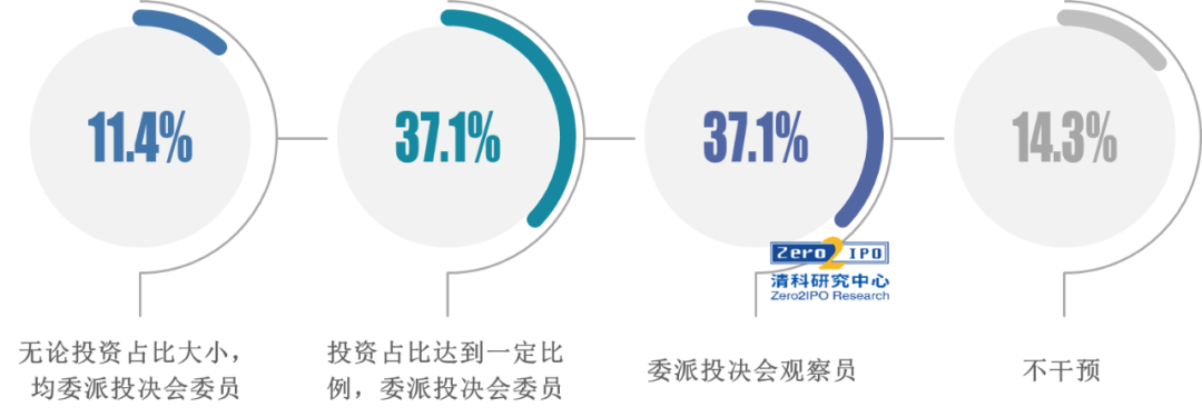 根據(jù)清科研究中心調(diào)研,機(jī)構(gòu)LP參與被投基金投決程度差異較大。參與被投基金投資決策程度的高低,一方面會(huì)取決于機(jī)構(gòu)LP與被投基金之間的博弈關(guān)系,另一方面會(huì)取決于機(jī)構(gòu)LP在被投基金中占股比例。一些參股規(guī)模相對(duì)較高、投資占股比例較大的機(jī)構(gòu)LP在被投基金中往往投資決策參與權(quán)較高,而參股比例較低的機(jī)構(gòu)LP往往話語(yǔ)權(quán)較小。同時(shí),一些品牌知名度較高、與被投基金管理機(jī)構(gòu)合作更為緊密、且能提供更多投后增值服務(wù)的機(jī)構(gòu)LP往往具有更高的投資決策參與權(quán)。