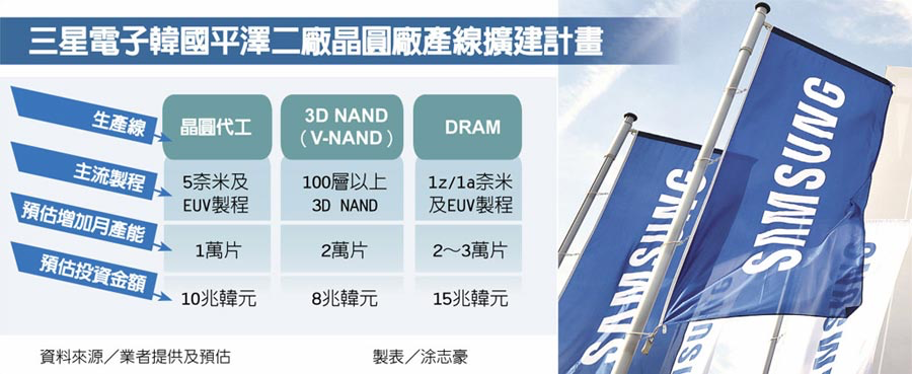 韓國三星電子繼日前宣布在韓國平澤二廠(P2)擴建極紫外光(EUV)晶圓代工生產線(10兆韓元)后,6月1日再宣布,將以8兆韓元在該廠擴大3D NAND記憶體產能,加上市場推估三星可能再加碼DRAM投資15兆韓元,這一波景氣危機,三星合計可能加碼33兆韓元(約新臺幣8千億元)大投資。由于三星的半導體策略一向是在景氣低迷時擴大投資,業(yè)界認為,三星近期可能會再宣布在P2廠DRAM產能追加投資計劃。