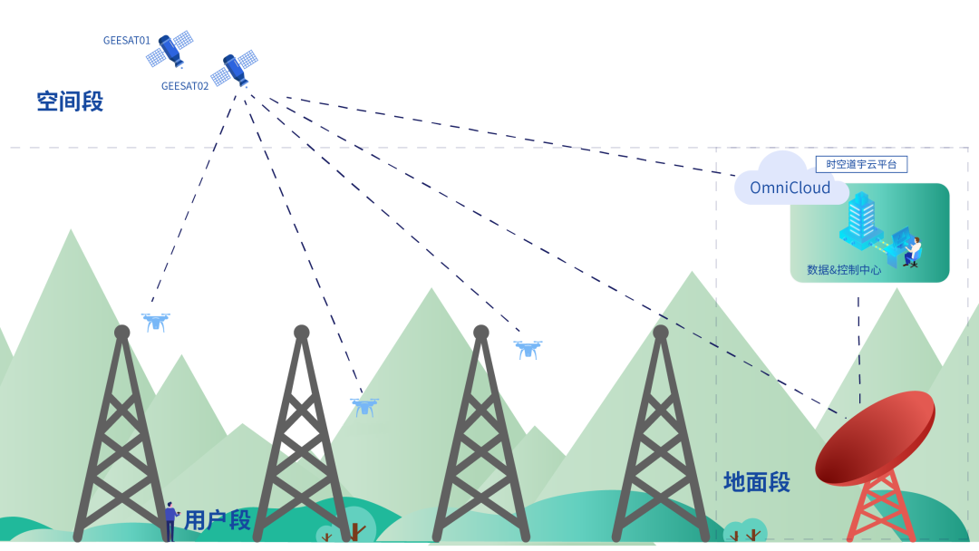 GEESAT-1天基導航增強業(yè)務驗證系統(tǒng)由空間段、地面段和用戶段組成:空間段為GEESAT-1首發(fā)雙星;地面段由衛(wèi)星任務控制中心和地球站組成,實現(xiàn)對衛(wèi)星在軌運行的管理;用戶段是各種衛(wèi)星應用終端,接收衛(wèi)星信號,實現(xiàn)高精定位。
