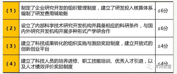 企業(yè)創(chuàng)新能力主要從知識產權、科技成果轉化能力、研究開發(fā)組織管理水平、企業(yè)成長性等四項指標進行評價。各級指標均按整數(shù)打分,滿分為100分,綜合得分達到70分以上(不含70分)為符合認定要求。四項指標分值結構如下: