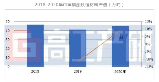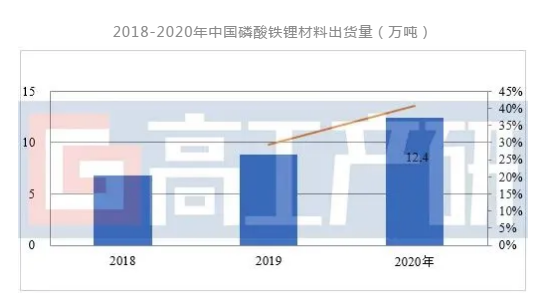 據(jù)高工產(chǎn)研鋰電研究所(GGII)數(shù)據(jù)調(diào)研顯示,2020年中國磷酸鐵鋰正極材料出貨量大幅增長,出貨12.4萬噸,同比增長41%,市場規(guī)模約45億元。