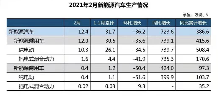 中汽協(xié)發(fā)布數(shù)據(jù),2月新能源汽車產(chǎn)銷量分別達(dá)到12.4萬輛和11萬輛,環(huán)比下降36.2%和38.8%,同比增長7.2倍和5.8倍,連續(xù)8個月實(shí)現(xiàn)同比正增長。