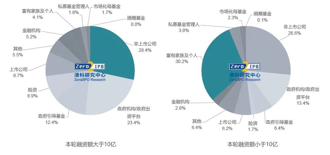 根據(jù)清科研究中心統(tǒng)計(jì),在本輪融資額大于10億的基金中,政府機(jī)構(gòu)/政府出資平臺、政府引導(dǎo)金類LP出資金額較大,累計(jì)占比約35.8%,險(xiǎn)資和金融機(jī)構(gòu)類LP相對占比較大,累計(jì)占比約14.1%,而在本輪融資額小于10億的基金中,富有家族及個人投資活躍度較高,占比約30.2%。
