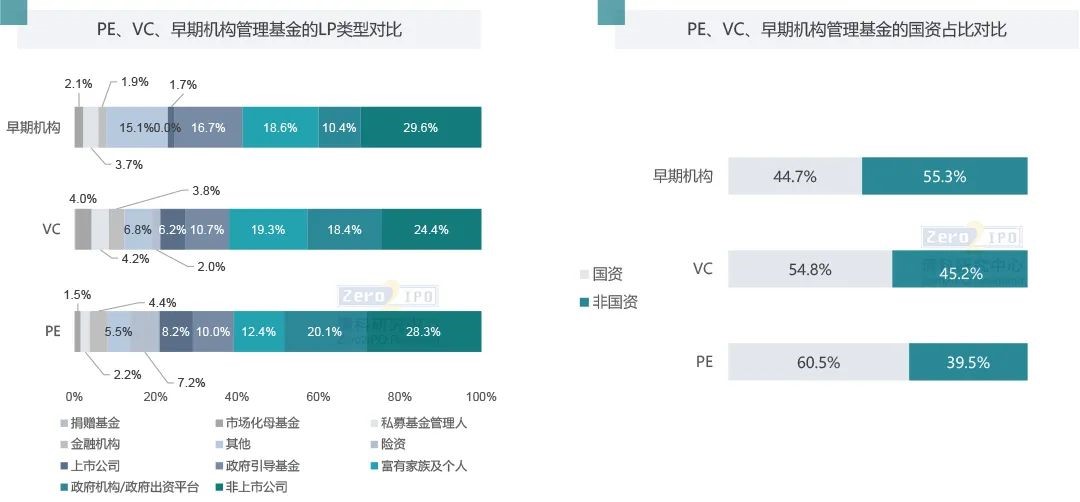 圖4 PE、VC、早期機(jī)構(gòu)2020新募集基金的LP類別與國資屬性構(gòu)成情況