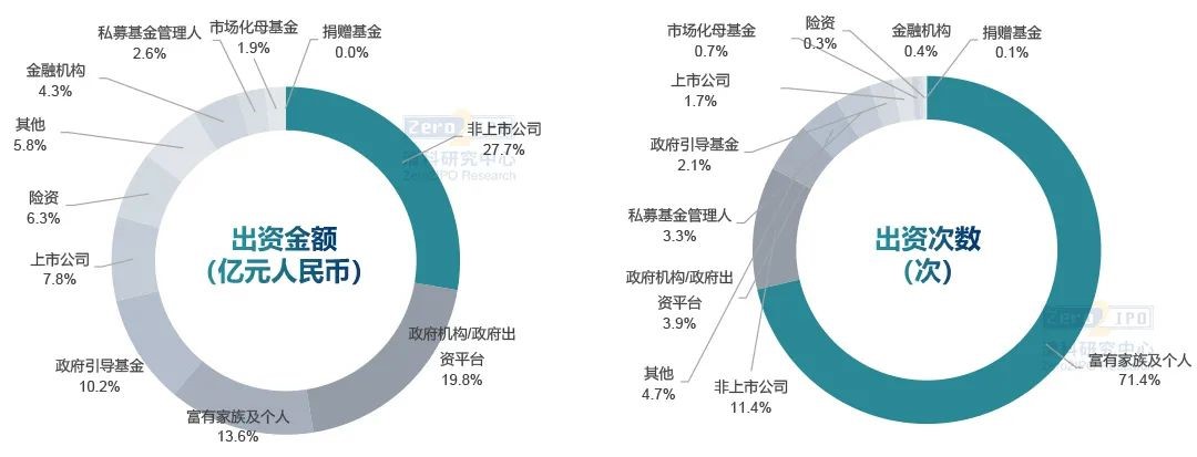 機(jī)構(gòu)LP中政府機(jī)構(gòu)/政府出資平臺、政府引導(dǎo)基金投資活躍度較高,累計(jì)出資超1,500筆,投資總額逾1,870億;相比之下,市場化母基金總體投資規(guī)模仍較小,累計(jì)投資約119億,較去年同比下降約37%。富有家族及個人出資活躍度顯著提升,累計(jì)出資超18,000筆,投資額逾850億,同比提升約78.6%。