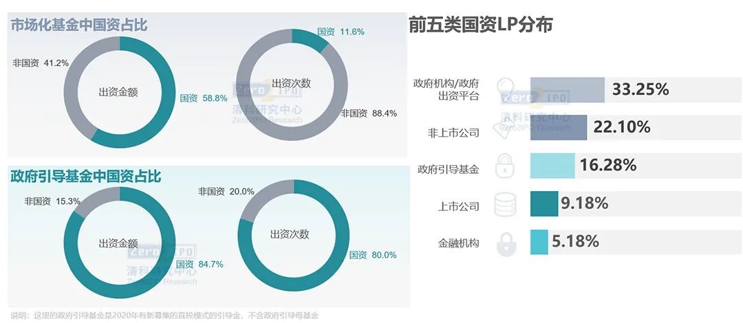 根據(jù)LP國資屬性來看, 2020年新募集人民幣基金中,出資次數(shù)僅11.8%(主要是富有家族及個人投資者出資次數(shù)占比較高)的國資LP認(rèn)繳總規(guī)模達(dá)到59.3%,其中,市場化人民幣基金中國資LP出資額占比達(dá)到58.8%,2020年新募集政府引導(dǎo)基金(僅指直投基金)中國資LP出資額占比相對更高達(dá)到84.7%。