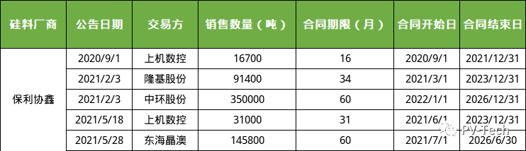 2)中環股份:公司于2019年開始使用顆粒硅。2021年2月3日,公司公告與保利協鑫簽訂《多晶硅購銷合作長單框架協議》。合同規定在2022年1月至2026年12月期間,