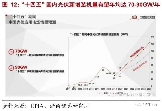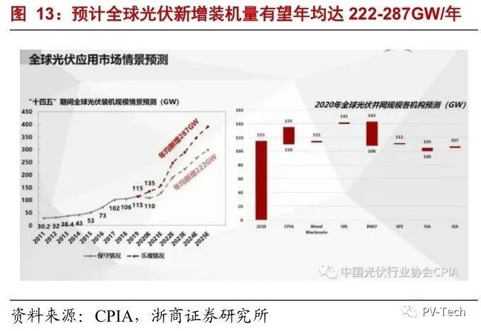 2) 2020年國內和全球光伏新增裝機量為48.2GW和130GW。在“十四五”期間,CPIA預計中國年均新增裝機有望達70-90GW,全球年均有望達222-287GW,遠超目前水平,光伏行業硅料供需缺口急需解決。