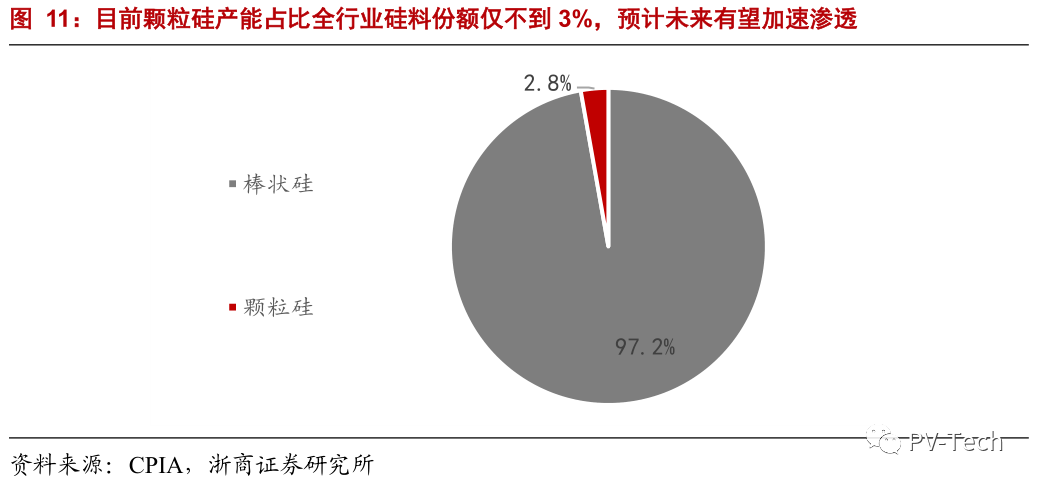 3) 目前顆粒硅在全行業硅料市場份額占比僅不到3%左右。我們預計,隨著顆粒硅技術的不斷成熟、得到下游認可,市占率有望加速提升。