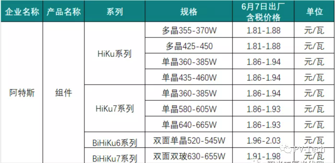 另一方面,多晶用料在近期新一波談價中,價格已來到每公斤115元人民幣上下。迫于上游價格壓力,組件價格也來到近兩年的歷史高位。6月7日,阿特斯光伏組件產品含稅出廠價顯示,多晶組件含稅出廠價1.81-1.88元/W,單面單晶360-665W含稅出廠價1.81-1.94元/W,雙面雙玻520-655W含稅出廠價1.91-2.03元/W。