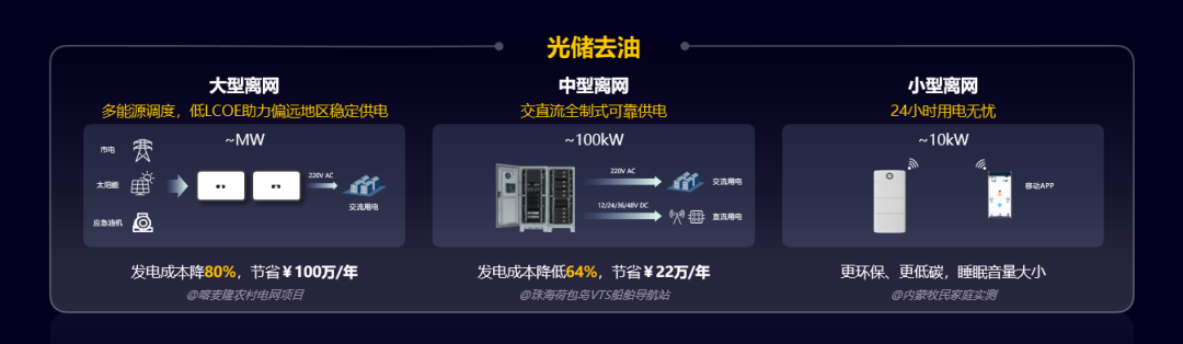 全球約9億人口處于無市電或電力不穩區域,普遍使用油機低效發電,但面臨高碳排放、燃油費用高、效率低、綜合成本高等問題,由此華為推出iPowerCube離網去油綜合供能解決方案,包括大、中、小功率段,涵蓋民生到生產全場景,光儲去油,降低發電成本60%以上,低碳環保,消除能源鴻溝。