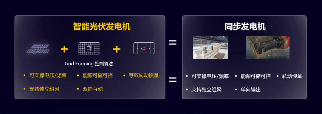 Grid Forming:使能光伏電壓源屬性,并網特性對標同步發電機,實現1. 智能光伏發電機 2. 可支撐電壓/頻率 3. 能源可儲可控 4. 等效轉動慣量 5. 支持獨立組網 6. 雙向互動等六大特性。