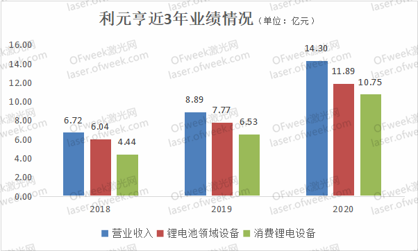 近三年,利元亨營業收入分別為6.72、8.89和14.30億元,其中主要收入均來源于鋰電池領域設備,分別為6.04、7.77和11.89億元。而鋰電池設備中,又以消費鋰電設備為主,近三年收入分別為4.44、6.53和10.75億元。