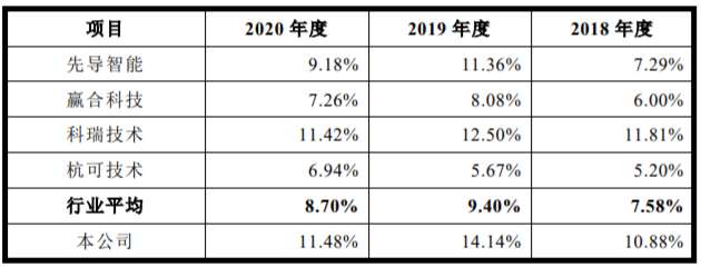 利元亨自成立以來一直注重對研發的投入,近三年公司研發費用占營業收入的比例分別為10.88%、14.14%和11.48%,與主要競品相比處于領先位置,高于行業平均水平。具體情況如下: