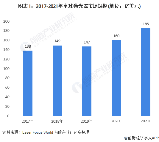 Laser Focus World初步估計(jì)2020年全球激光器市場(chǎng)總收入增長(zhǎng)為160億美元,預(yù)計(jì)2021年市場(chǎng)表現(xiàn)更加強(qiáng)勁,收入增長(zhǎng)率有望達(dá)到15.5%,全球激光器行業(yè)市場(chǎng)規(guī)模達(dá)185億美元。