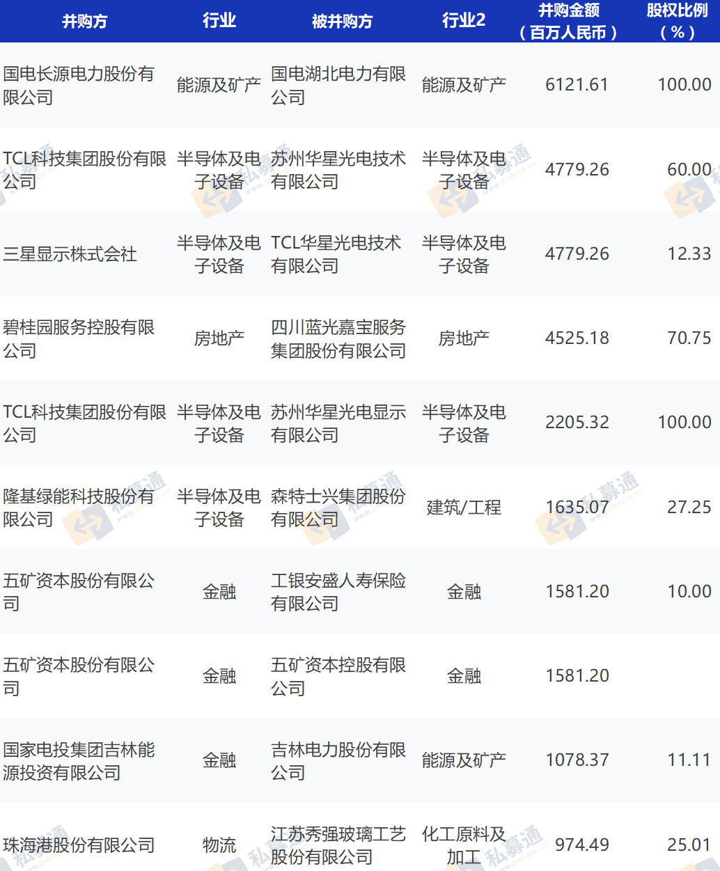 從并購(gòu)交易類(lèi)型來(lái)看,本月國(guó)內(nèi)交易共發(fā)生161筆交易,占并購(gòu)案例總數(shù)的97.6%,其中披露金額的案例134筆,總金額為429.92億人民幣;海外交易共發(fā)生3筆,其中披露金額的案例3筆,總金額為11.73億人民幣;外資交易共發(fā)生1筆,交易金額為47.79億人民幣;本月交易金額較大的兩筆并購(gòu)案例為:國(guó)電長(zhǎng)源電力股份有限公司收購(gòu)國(guó)電湖北電力有限公司100%股權(quán),交易金額為61.22億人民幣;TCL科技集團(tuán)股份有限公司收購(gòu)蘇州華星光電技術(shù)有限公司60%股權(quán),交易金額為7.39億美元(約47.79億人民幣)。