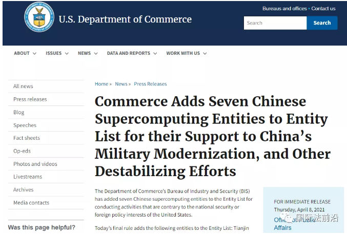 美國商務(wù)部官網(wǎng)4月8日發(fā)布公告,將7個(gè)中國超級計(jì)算機(jī)實(shí)體列入“實(shí)體清單”(Entity List),原因是這些實(shí)體涉嫌“破壞軍事現(xiàn)代化的穩(wěn)定”并且“與美國國家安全和外交政策利益背道而馳”。