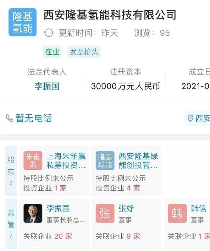 2021年3月31日隆基通過全資子公司隆基綠能創(chuàng)投與上海朱雀投資,合資成立西安隆基氫能科技有限公司,注冊資本金3億元。李振國總親自擔(dān)任法定代表人、董事長兼總經(jīng)理。這是隆基入股森特,強(qiáng)勢布局BIPV之后的又一大動(dòng)作。