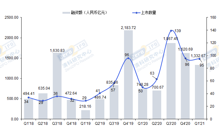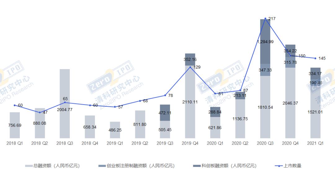 圖1 2018Q1-2021Q1中企境內(nèi)外上市數(shù)量及融資總金額