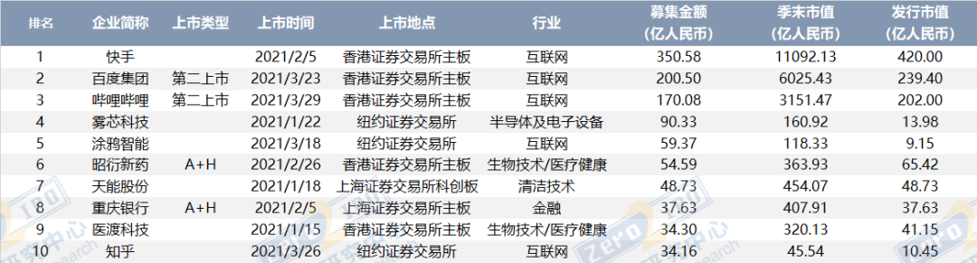 (1)2021年一季度前十的IPO企業(yè)總?cè)谫Y金額占比近五成