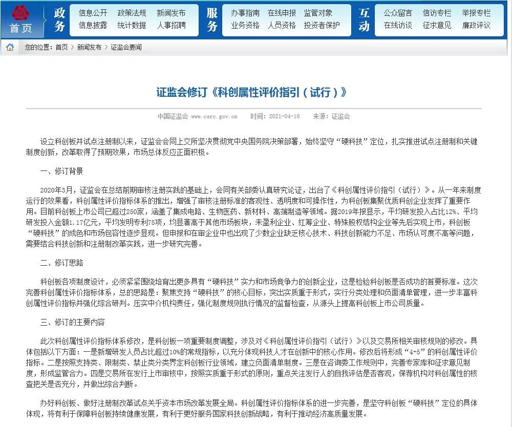 證監(jiān)會(huì)4月16日就科創(chuàng)板《科創(chuàng)屬性評價(jià)指引(試行)》(簡稱《指引》)作出修訂,完善科創(chuàng)板制度的首要標(biāo)準(zhǔn),將科創(chuàng)屬性評價(jià)指標(biāo)將由原來的“3+5”變?yōu)?ldquo;4+5”,旨在“培育出更多具有硬科技實(shí)力和市場競爭力的創(chuàng)新企業(yè)”,這是檢驗(yàn)科創(chuàng)板是否成功的一個(gè)首要標(biāo)準(zhǔn)。