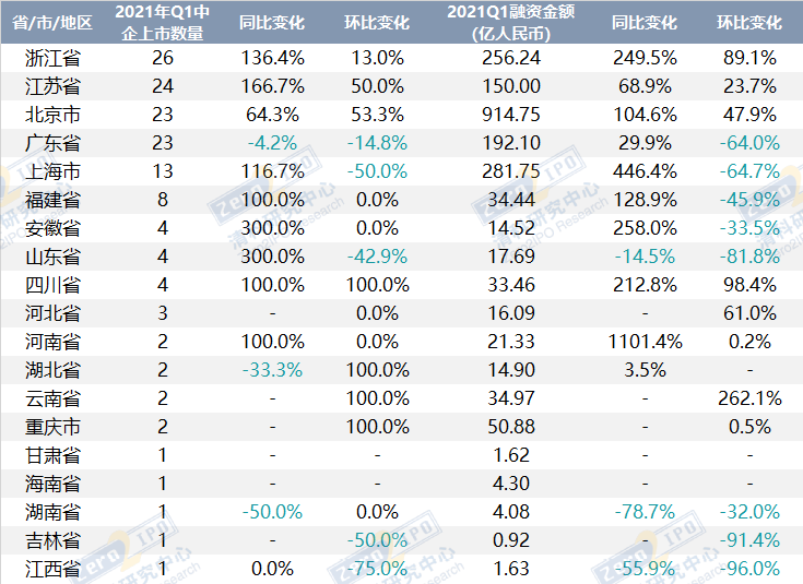 1. 2021年第一季度,浙江IPO數(shù)量領(lǐng)跑全國。