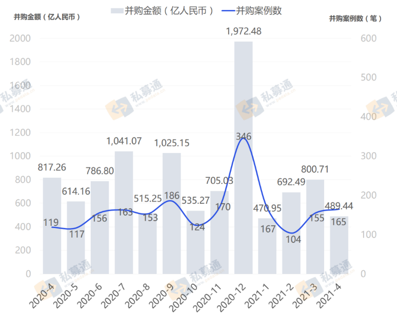 根據(jù)清科旗下私募通數(shù)據(jù)顯示,2021年4月中國(guó)并購(gòu)市場(chǎng)共完成165筆并購(gòu)交易,數(shù)量環(huán)比上升6.5%,同比上升38.7%。其中披露金額的有138筆,交易總金額約為489.44億人民幣,環(huán)比下降38.9%,同比下降40.1%。