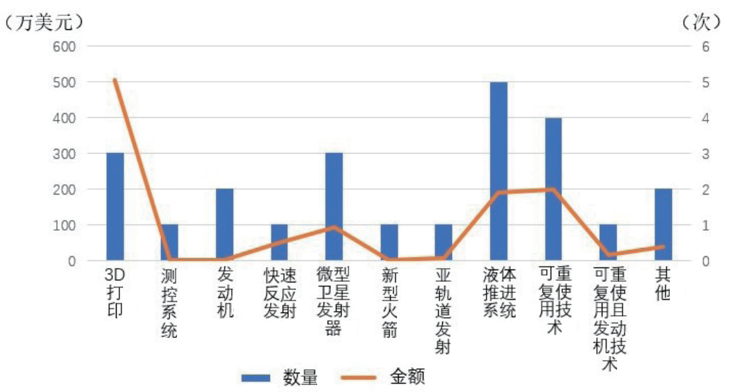 從商業(yè)航天產(chǎn)業(yè)發(fā)射領(lǐng)域投融資情況來看,2020年商業(yè)資本已進(jìn)入航天發(fā)射各細(xì)分領(lǐng)域,從發(fā)射測控系統(tǒng)改進(jìn)、發(fā)動(dòng)機(jī)、新型火箭燃料研制,到液體火箭、微型衛(wèi)星發(fā)射器、亞軌道火箭、可重復(fù)使用火箭研制,再到利用3D打印技術(shù)制造火箭、開發(fā)快速反應(yīng)發(fā)射服務(wù),均有資本投入(圖1)。其中,液體火箭、可重復(fù)使用火箭制造細(xì)分領(lǐng)域,商業(yè)資本投融資數(shù)量最多,發(fā)射領(lǐng)域近四成的投融資活動(dòng)在這兩個(gè)細(xì)分領(lǐng)域;但利用3D打印技術(shù)制造火箭細(xì)分領(lǐng)域投入的金額最大,幾乎近一半的發(fā)射領(lǐng)域投融資金流入此細(xì)分領(lǐng)域。