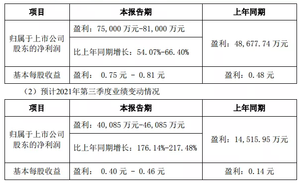 9月27日,華工科技發布公告披露前三季度業績預告。華工科技預計2021年1月-9月歸屬于上市公司股東的凈利潤為7.5億元-8.1億元,比上年同期增長54.07%-66.40%,基本每股收益為0.75元-0.81元。華工科技預計2021年第三季度歸屬于上市公司股東的凈利潤為4.01億元-4.61億元,比上年同期增長176.14%-217.48%,基本每股收益為0.40元-0.46元。